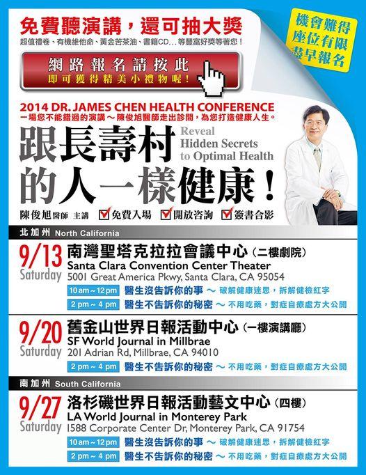 九月份快到了 08/20/2014 07/12/2022 九月份快到了,我在北加和南加共有三場大型演講,請大家告訴大家,有興趣的人千萬不要錯過了! 詳情請看www.DrJamesChen.com 轉載自:【陳俊旭 美國自然醫學博士】Facebook 瀏覽人次: 429