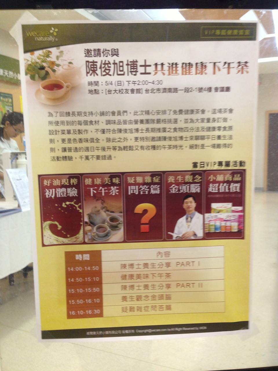 昨天在台大校友會館所舉辦的健康茶會圓滿落幕。 05/05/2014 07/13/2022 這是我第一次在台灣示範如何用有機食材做出既健康又美味的餐點,上一次示範是在美國加州的過敏補習班。 由於WCN小舖積極籌備在台北的第一家門市,所以在有機蔬果和生鮮食材方面,已經找到高品質的源頭,昨天在場享用的人應該都已品嚐到,高品質的有機食材真的很好吃! 會後和WCN營養師群合影,大家有營養和健康上的問題,可以打電話找她們免費咨詢喔! 轉載自:【陳俊旭 美國自然醫學博士】Facebook 瀏覽人次: 420