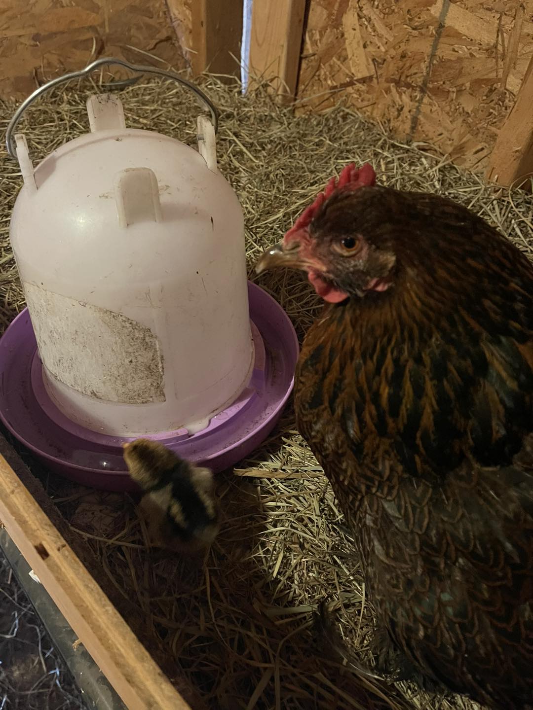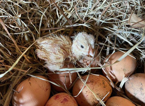 結果,今天早上,真的有一隻小雞孵出來了!濕答答的,還有一點血跡。但沒過多久,就毛茸茸地躲在母雞的翅膀下了。