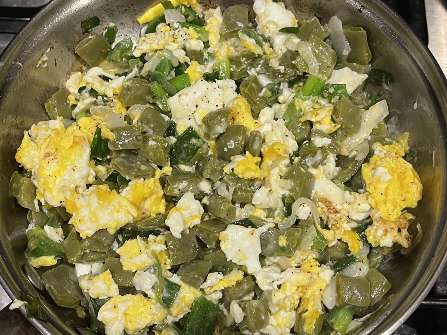 仙人掌去刺後,切成小塊,川燙到變成橄欖色,瀝乾,就可以和大蒜、青蔥、蛋、青辣椒,炒在一起。