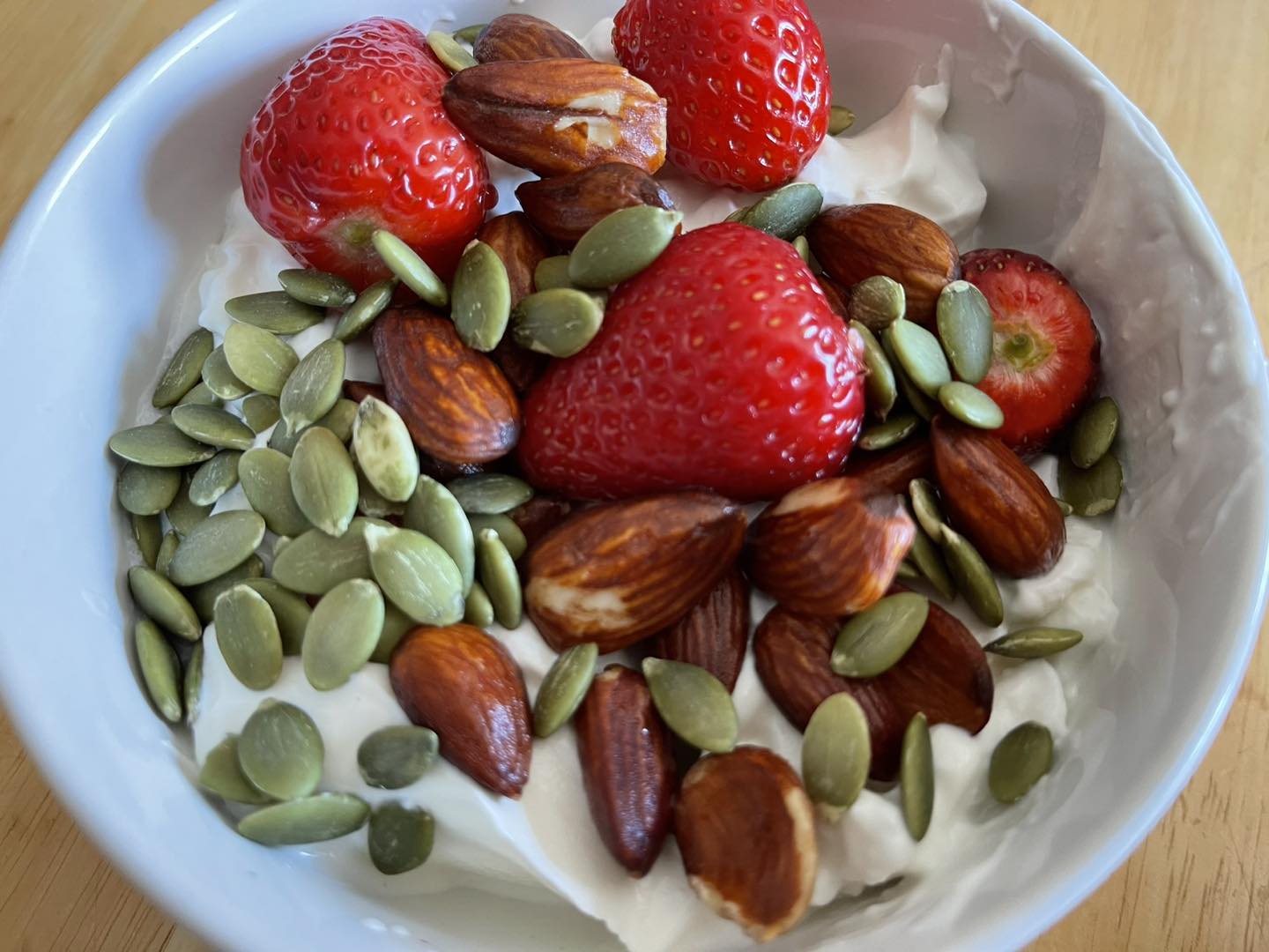 飲食中的優質蛋白質和優質脂肪,千萬不要忽略。這一餐的蛋白質我就吃雞胸肉,事先抹一點檸檬鹽去氣炸,味道就會很棒。杏仁和南瓜籽灑在sour cream上面,很有嚼感。