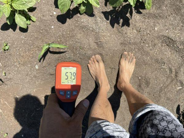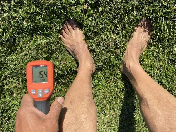 我測過乾燥土壤、潮濕土壤、草地上,赤腳踩地真的很舒服。土壤溫度57度不覺太燙,草地15度也不覺太冷,都很舒服,尤其小草散發微微濕氣,那種感覺特別好。