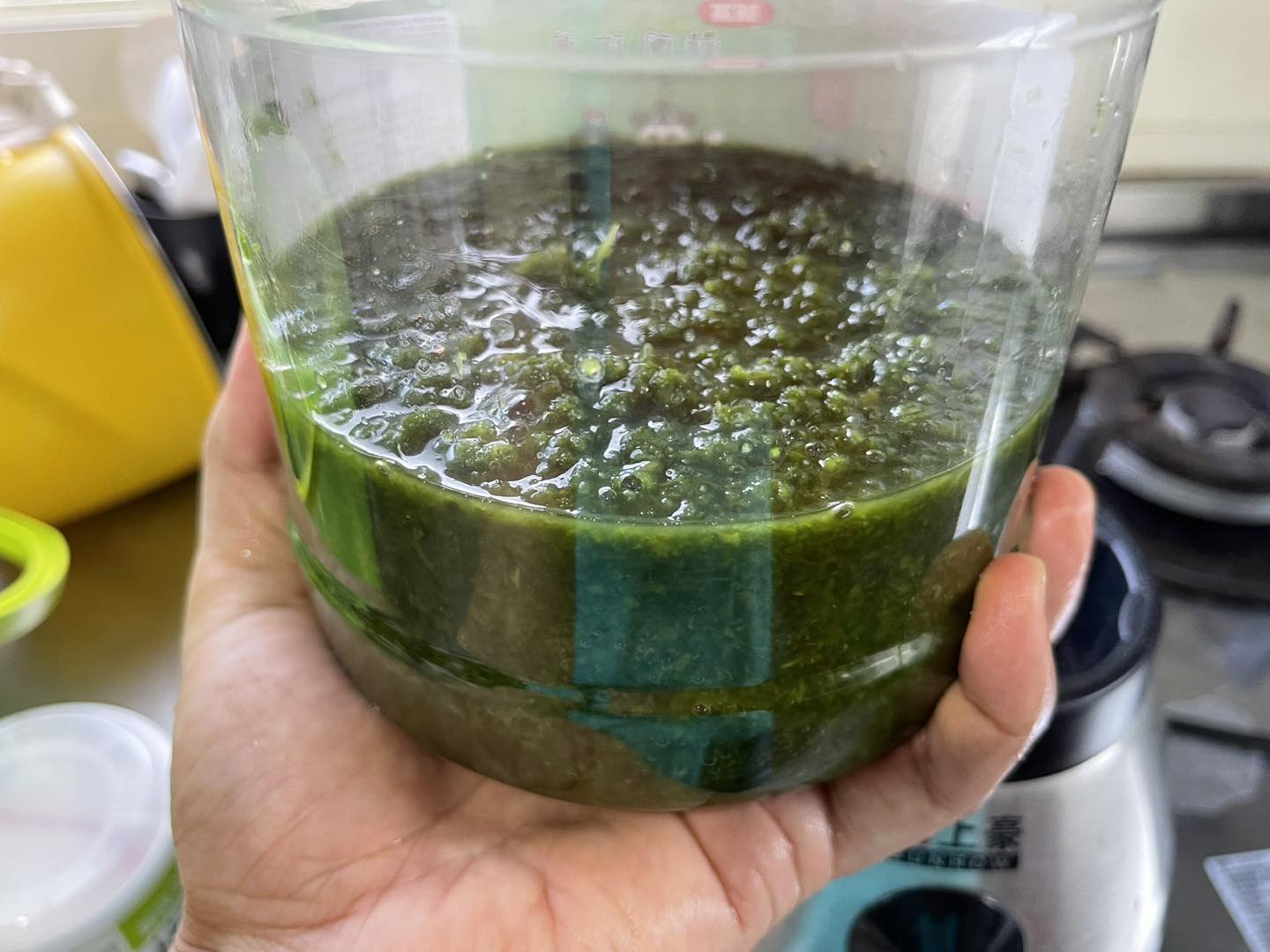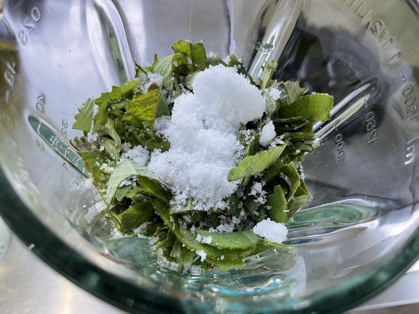 把葉片、酒精、鹽巴,放入果汁機裡面,打碎,然後倒入罐子,在冰箱靜置一週以上,讓有效成分充分溶入酒精,最後取出過濾、裝瓶,就可長久保存。