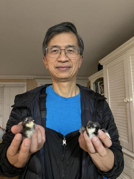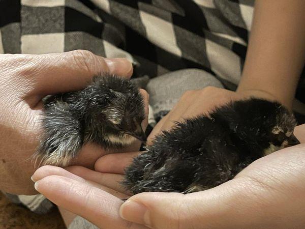 剛直播結束,就看到二隻剛從孵化器孵化出來的小雞。長得很像小企鵝,我手靠過去,其中一隻就爬上來,另外一隻也跟著爬上來。