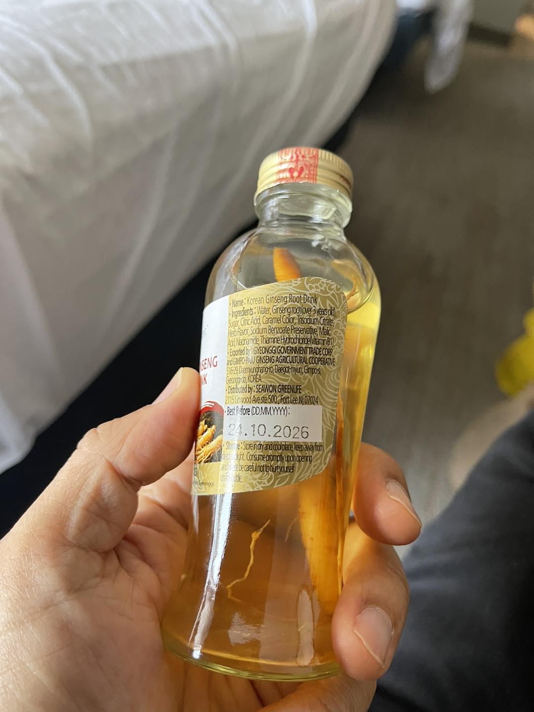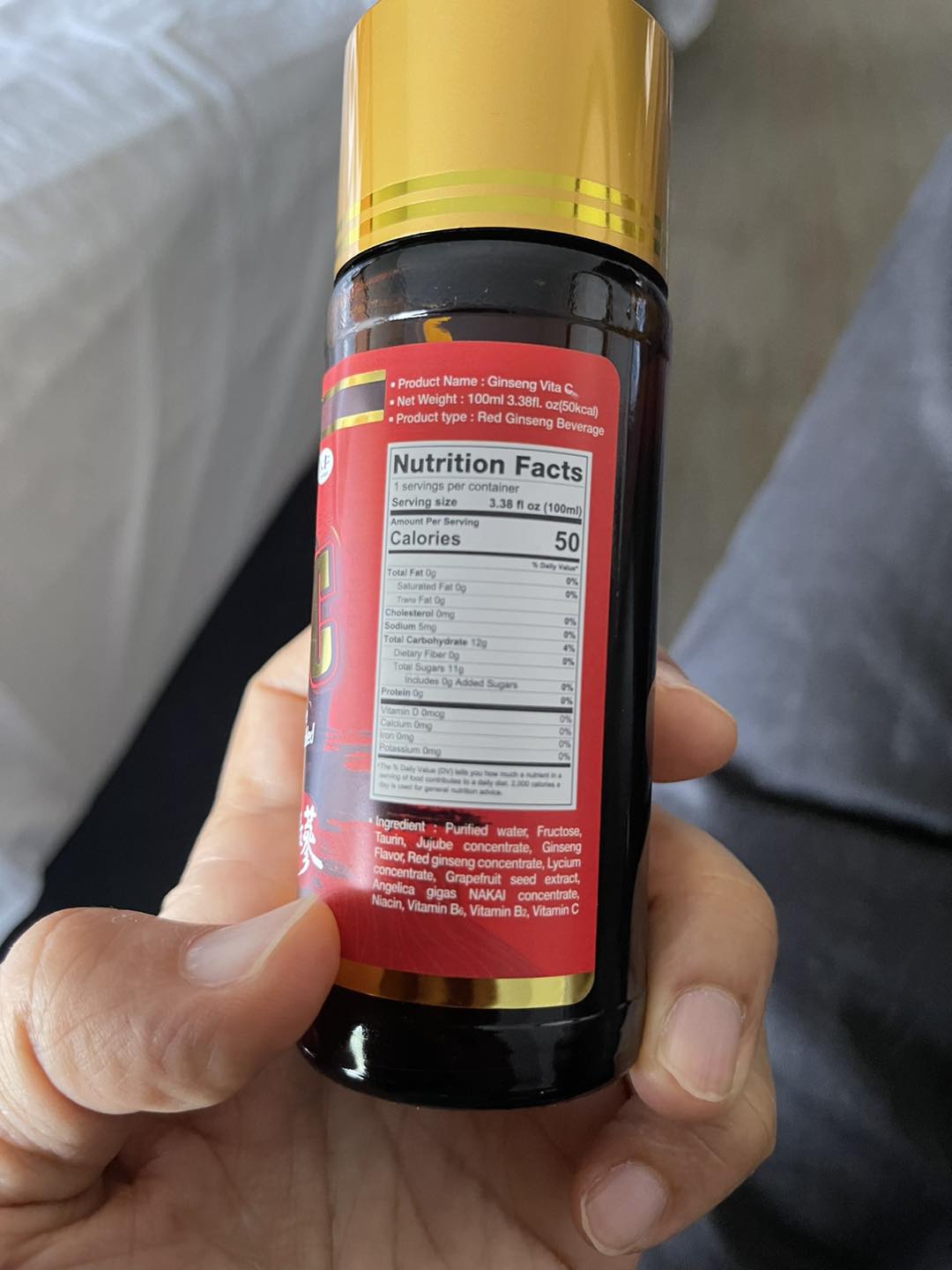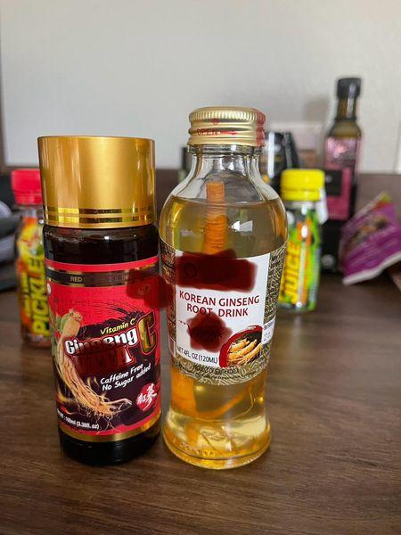 昨天在紐約新奇食品展拿了很多樣品。有二瓶韓國高麗蔘能量飲料看起來包裝精美,但一瓶有防腐劑,一瓶有果糖(瓶貼上還註明no sugar!),所以我沾一小口,品嚐一下味道,就不喝了!