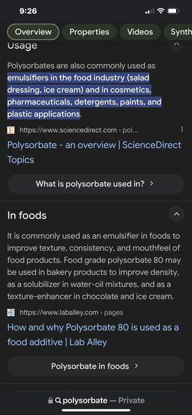 不管怎樣,polysorbate被廣泛使用在食品和化妝品上,例如沙拉醬、冰淇淋、洗潔劑、塑膠製品等等,非常容易被誤食和誤擦。