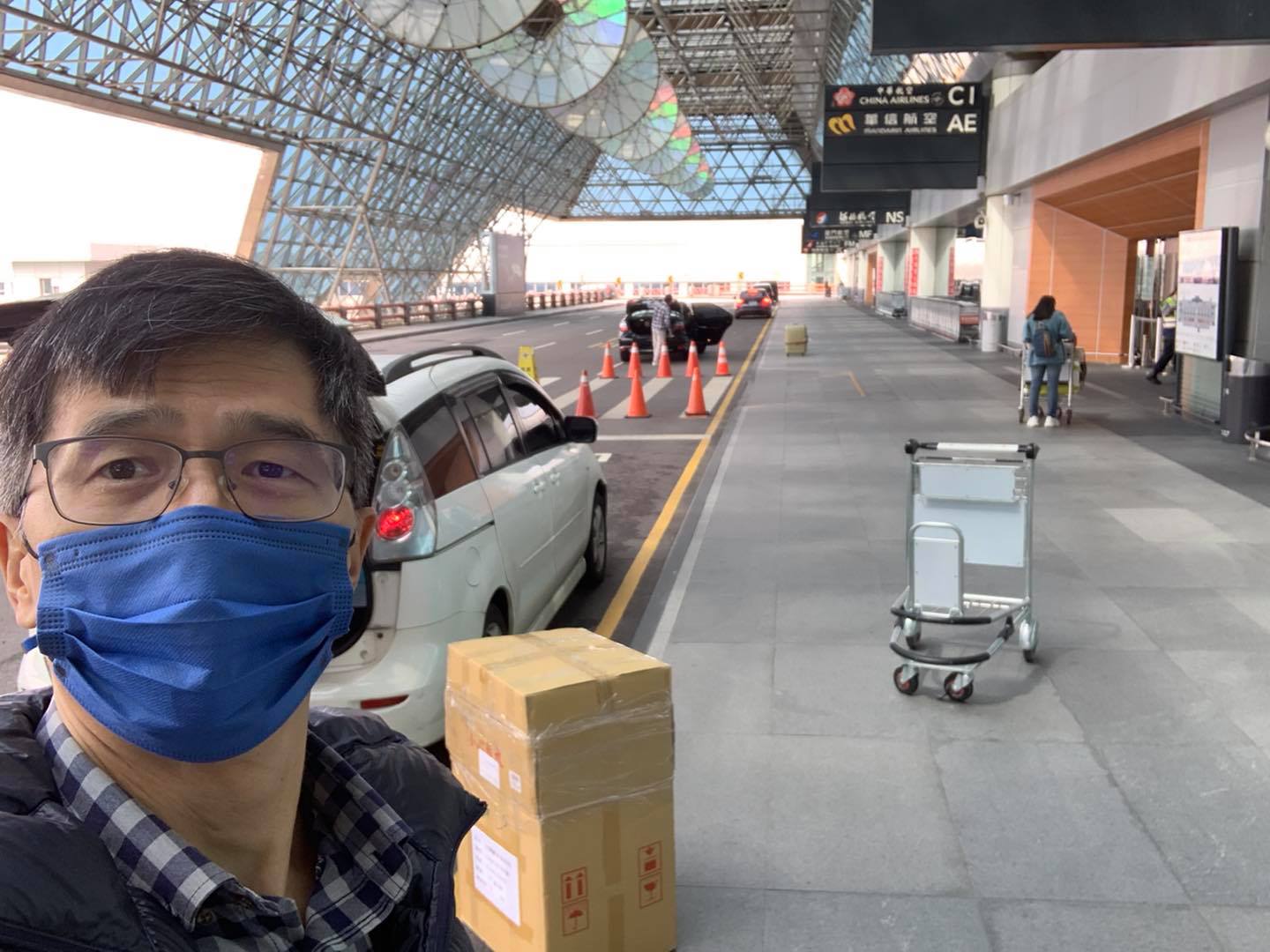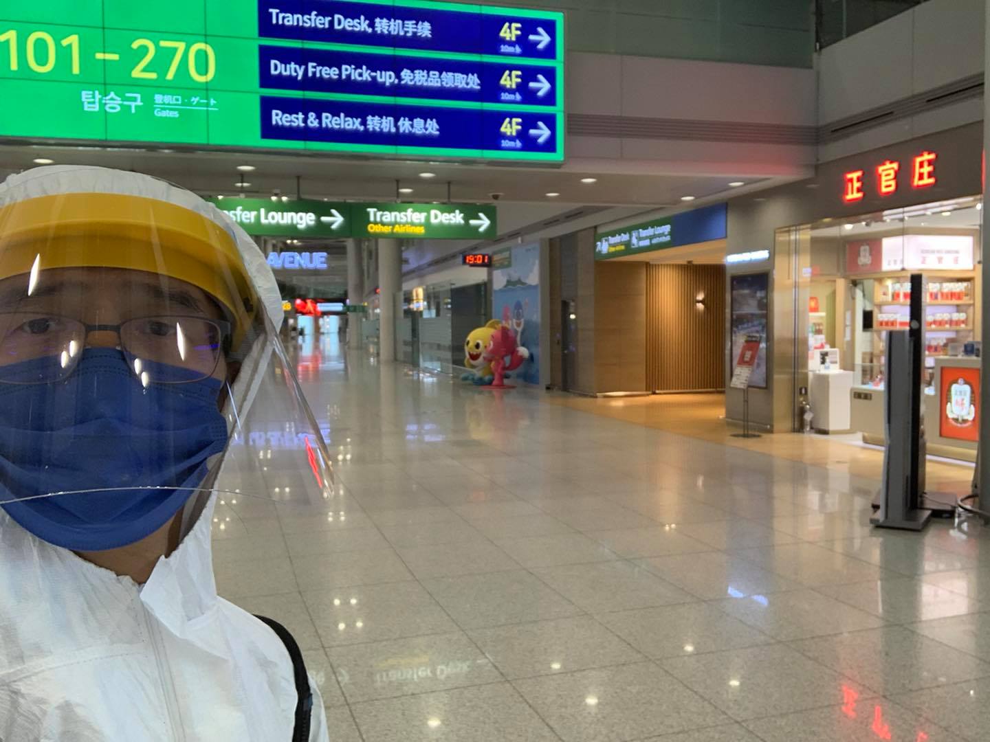 登機前穿妥朋友送我的防護衣,全副武裝實在很辛苦。前線的醫護人員每天要穿防護衣上班真是太偉大了。