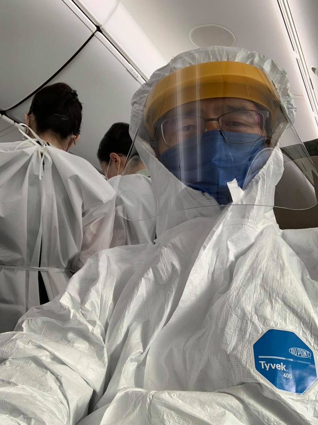 以下有一張照片很特別,我穿防護衣,後面的空服員也穿防護兜兜,乍看以為在醫院,其實是在飛機上。