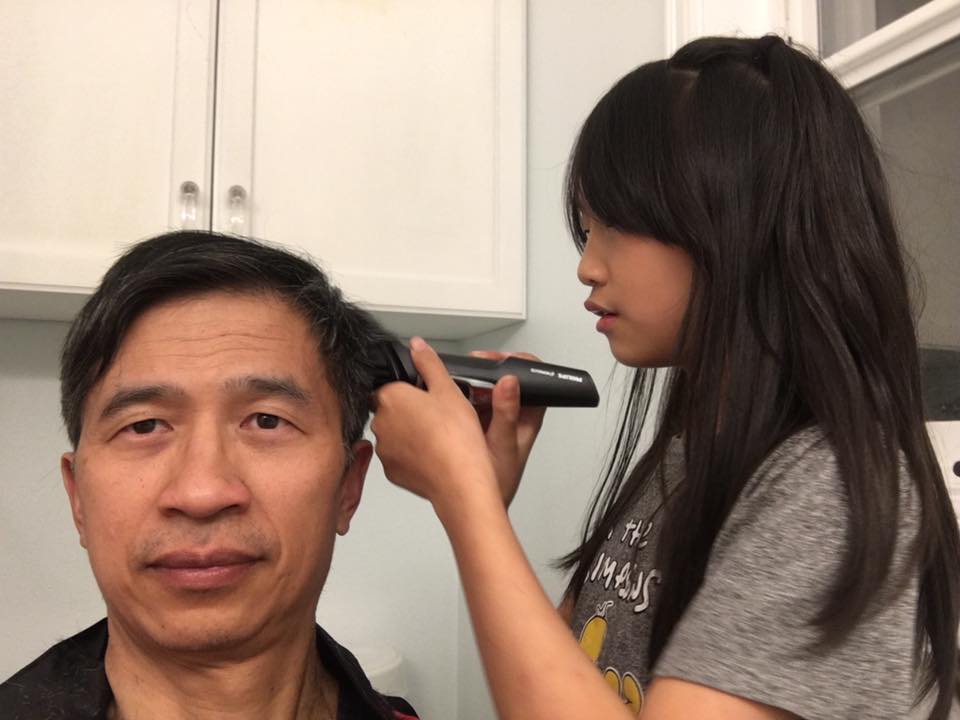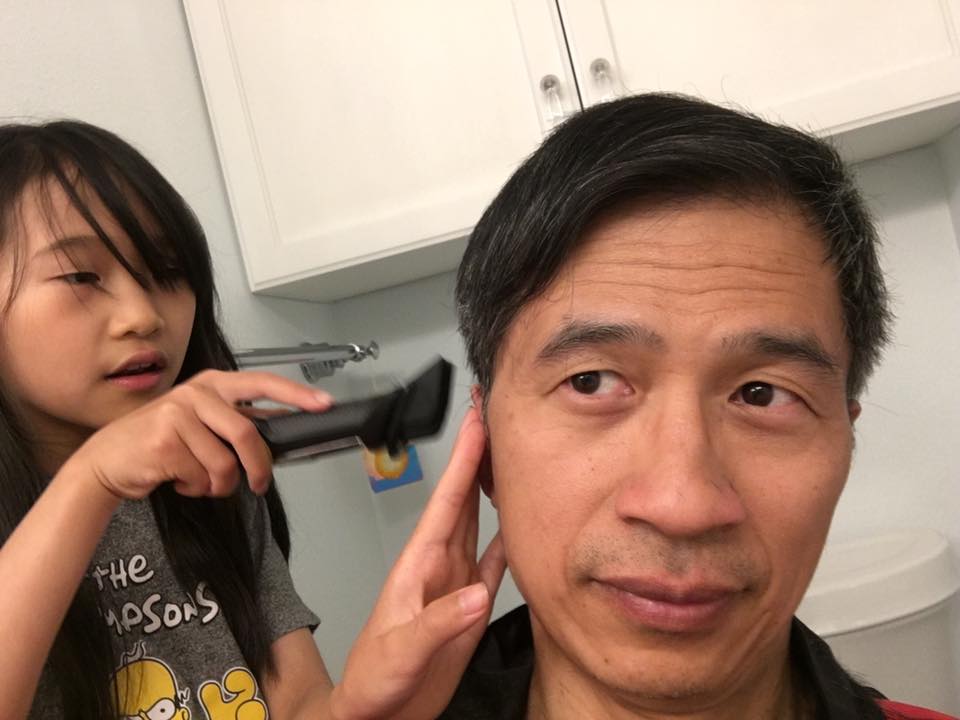 前幾天剛好路過Target, 好不容易買到一個三合一的電動理髮器,回到家,小女兒很高興幫我理頭髮。這是第二次。